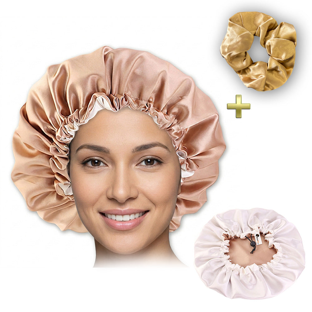 + Satin scrunchie to stick your hair up under the sleeping cap to minimize hair damage.