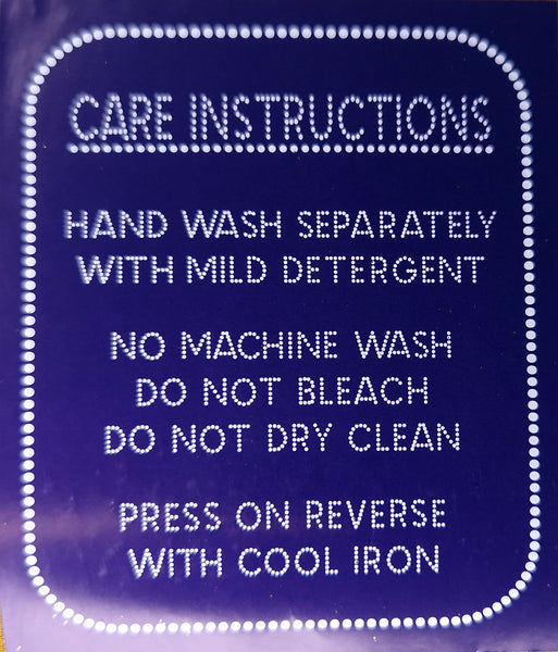 Special care instructions: Only cold wash by hand. Hand wash seperately with mild detergent. No machine wash. Do not bleach. Do not dry clean. Press on reverse with cool iron. These instructions must be followed to preserve the metallic effect as much as possible.