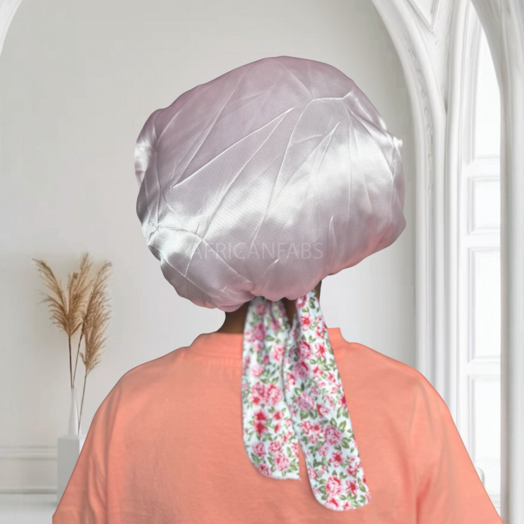 Pink flower Satin Hair Bonnet with Tie Straps (Kids / Children's size 3-7 years) ( Satin Night sleep cap)
